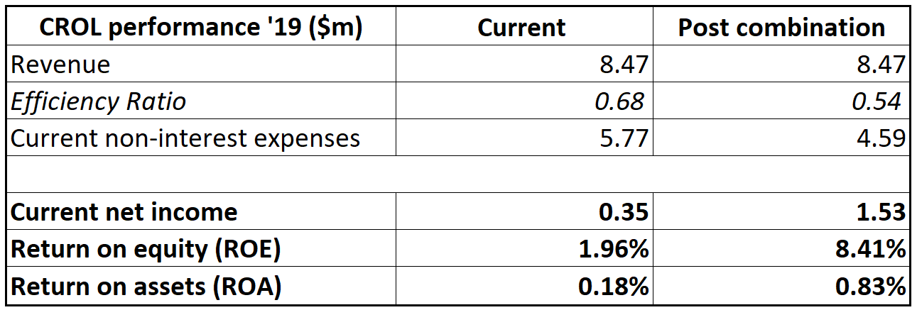 As indicated by the profitability ratios above (ROE), CROL operates considerably less efficiently than FMFG. Cost efficiency ratio currently stands at 0.68 (CROL) vs 0.54 (FMFG). Nonetheless, the combination should more or less eliminate the difference and increase the efficiency of the target bank to the acquirer levels. According to the calculations, this efficiency improvement would increase net income of CROL by about $1.2m therefore significantly improving the profitability of the company.