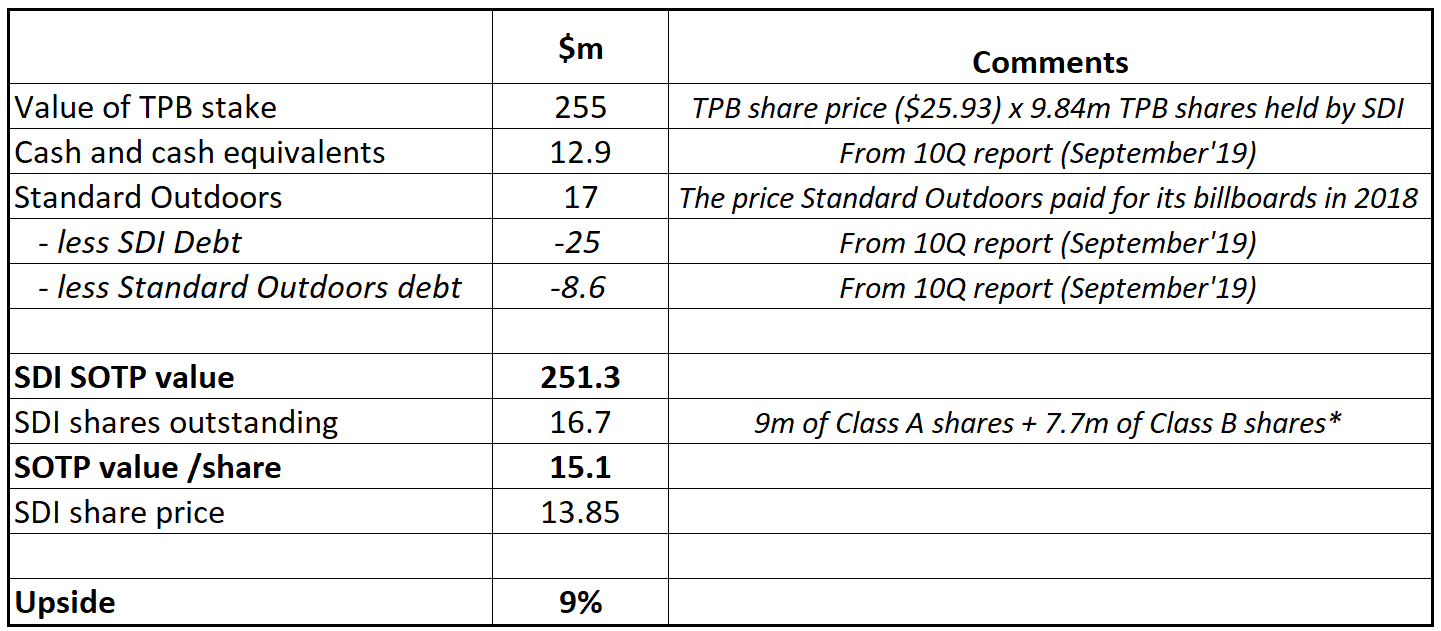 According to their website Standard General (SG) focuses on “companies with complex capital structures that are undergoing dramatic change or are faced with material events”. The fund has acquired a controlling stake in TPB in Q2 2016. Then in 2017 SG conducted a reverse merger with SDI (which at the time was a shell company called Special Diversified Opportunities) – as a result SDI has received 52% ownership in TPB, while Standard General has received 88% of Class A and 90% of Class B shares of SDI. It seems the intent of SG was to create a holding company that aside TPB stake would be used for multiple investments, however now that the plan fell through (with unsuccessful insurance and billboard investments), it has decided to collapse the structure and eliminate the discount.