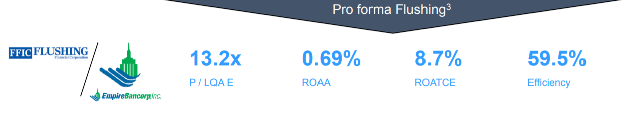 FFIC operates with considerably higher efficiency than EMPK (66% vs 82% respectively). Eventually FFIC expects to cut 50% of EMPK noninterest expenses increasing the pro forma profitability of the company.