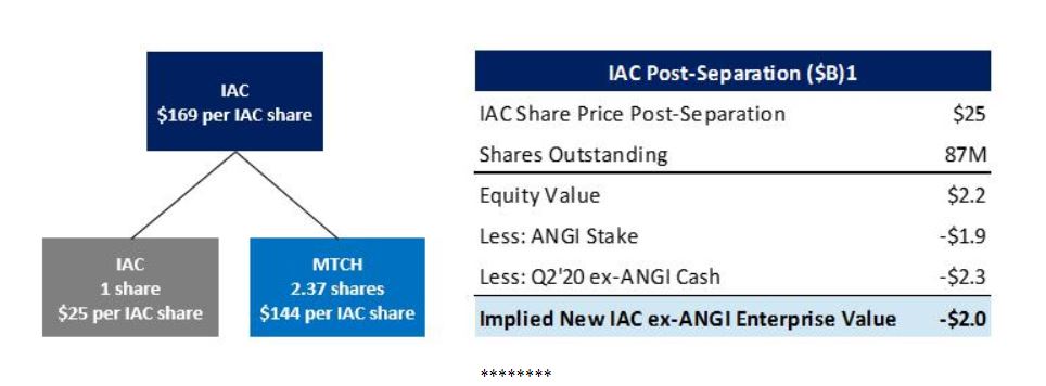 “At IAC’s current stock price, our market capitalization is $14.5 billion – that’s about $30 million higher than the value of our 80% interest in MTCH leaving aside the rest of our businesses and cash. In the separation, we currently expect that an IAC shareholder would receive 2.37 shares of MTCH (worth $144 per IAC share at today’s prices); subtracting that amount from the current IAC stock price would imply that the “stub” is worth $25 per share. At this price, backing out our anticipated cash balance and the value of our ANGI stake at current prices, the remaining assets of New IAC would be trading at an implied negative $2 billion value. We expect that will work itself out over time.”