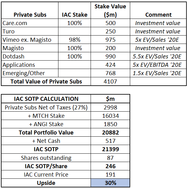 The second way is to aim a bit higher expecting that the market will finally start recognizing the value of other assets on IAC balance sheet. Approach of MTCH split-off date should act as a catalyst for that as well. Total sum-of-the-parts value of IAC stands at $246/share (30% upside).