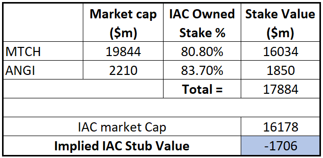 Closing this one out as MTCH separation has been completed and IAC stub (excluding ANGI stake and additional cash received for MTCH shares) no longer trades at a negative valuation.
