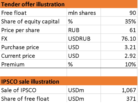 Overall it appears quite strange that the company operating in oil industry is cashing out minority shareholders in the current oil/macro environment. I would understand is this as a really opportunistic offer at very low prices, but now 61Rub/share is a premium to where TMK used to trade before the current crash.