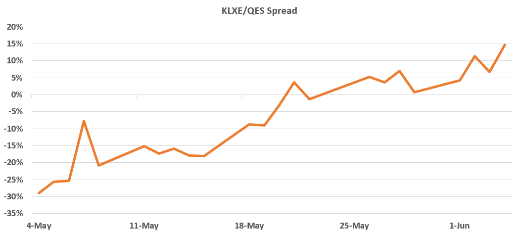 I posted this over the weekend, but it seems the spread shrunk to 7% on Monday’s open with QES moving +36% and KLXE +29%. Meanwhile, I don’t see any updates to explain this movement today.