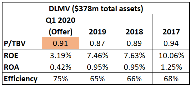 - This year in March it bought MB Bancorp ($115m in assets) for $31m in cash. It was priced also similarly at discount to BV (0.93x BV, while DMLV offer stands at 0.91x) and closed in 6 months.