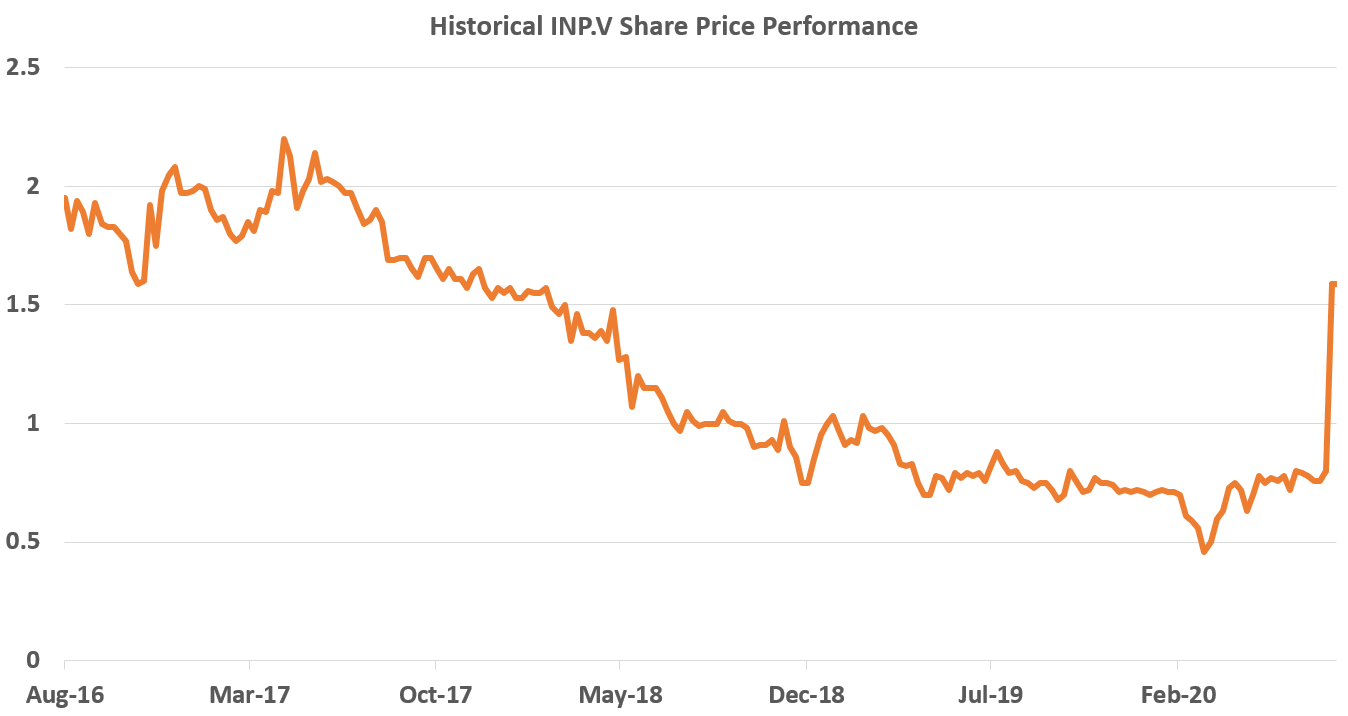 Given the 3-year-high price (103% premium to closing price and 150% premium to the tender offer carried out in April), an attractive 1.4x BV multiple (reached only back in 2016) and support from the major shareholders it seems that the offer should go through. The situation likely exists mainly due to the small size of the deal and INP.V trading in TSXV, which isn’t the typical hunting grounds of merger arb folks.