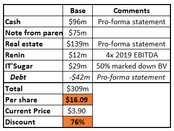 value creation given it is hard to see New BBX Capital trading with a negative EV given its expected $130M in cash, over $100M of real estate investments, an EBITDA-positive Renin business, and a reduced-liability IT’SUGAR. Even if New BBX Capital only traded at a $20M EV (and $150M market cap) the stock would trade at over $8/sh”.