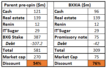A comparison with the parent company prior to the spin-off also shows that the current discount size of BXXIA is unwarranted. BBX/BXG market cap was used as of the 15th of July’20.