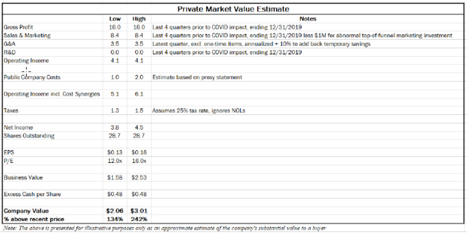 - In September, Silver Ring Partners (largest shareholder with a 9.8% stake) started a rather soft activism campaign and issued a letter to the board criticizing its new acquisition-focused strategy (a bit more info below). Silver Ring recommended the board to stop considering acquisitions and pursue an active sale process of the company instead. It also asked the board to start returning excess cash to shareholders once the business is solidly profitable. The activist commended the board on rejecting the rumored $1/share bid (DBG), claimed that CTHR value on the private market is between $2.06 – $3.01/share, and has also asked for two board seats (by expanding the board from 5 to 7). The board has not issued any response yet. Silver Ring became a major shareholder of CTHR this year in Feb (5.3% stake) and since then has continued to increase its stake. The initial filing was 13G, so it seems it had no intention to go activist at the start. Silver Ring is a small and concentrated investment fund with 11% of the portfolio in CTHR as of Q2’20.
