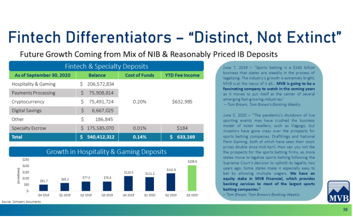 The company has a significant amount of deposits from the fintech and gaming sectors. As of Q3 fintech, deposits amounted to $365m (56% of those are gaming), which is 19% of the total deposits.