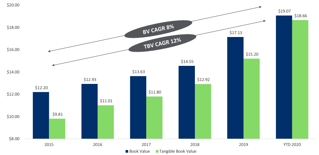 The bank managed to perform quite well and continued to grow (through acquisitions) during the pandemic. In Q3 TBV increased to $18.66/share vs $16.65/share in Q2’20 and $15.20/share in 2019: