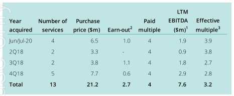 The company acquires the new services rather cheaply (4x EBITDA) and then continues to grow them, improving the utilization rate/occupancy and profitability. Effective multiple (purchase price and earn-out/LTM EBITDA) of the services acquired in 2018 is now significantly better vs the 4x multiple made at the time the center was purchased: