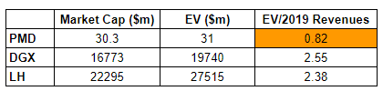 Opportunistic timing increases the chances of a takeover. Due to the COVID-19 outbreak drug testing volumes were strongly impacted. However, the company is recovering and the demand for its services is expected to resume quickly after the pandemic is over. PMD still trades 50% below pre-COVID levels, while the demand for drug screening is expected to resume quickly. Assuming the eventual recovery in revenues to 2019 levels PMD currently trades 0.82x EV/Revenue multiple, which is cheap for a consistently profitable company (pre-COVID). Also it is below the historical PMD valuation multiples as well as below peers.