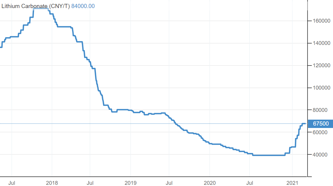 Increased momentum in EV sales resulted in higher lithium demand, which is now outpacing the apparently tight supply. This trend is expected to continue – Benchmark Mineral Intelligence forecasts a 6k tonne lithium deficit this year vs what used to be a balanced market in 2020.