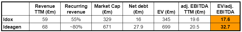 - The current consideration is around the all-time high share price of IDOX and was reached only one time in 2016 and a few times in 2017. However, the valuation stands at 17.6x adj. EBITDA’20, which doesn’t seem a stretch for a SaaS business with a large percentage of recurring revenues. For a few years now, Idox has been transitioning its business to a SaaS model, sold its digital business segment, replaced the management, and grew its recurring revenues frow from 47% in 2017 to 55% in 2020. The current target is to reach 75% of the recurring revenues and 30% adj. EBITDA margin (was 29% in 2020). In comparison, Ideagen, a similar size Idox peer, has already completed the transition to SaaS, reports around 80% of recurring revenues and trades at 33x TTM adj. EBITDA valuation. Some of it may be attributed to Ideagen’s rapid growth through acquisitions (in the last 3 years made 9 takeovers), however, the next step in the Idox transformation plan is also the expansion through acquisitions. Overall, from a high-level, it seems that Dye & Durham is getting a good deal here, and there is definitely some room for a further offer price bump.