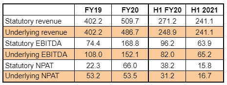 The biggest risk is that after finishing the due diligence, the buyers will decide not to proceed with a firm offer. Downside to pre-announcement stands at 15%. The actual downside could be different as since then, H1 FY21 results were released (February 21st) showing substantial COVID-19 impact on the business (see graphs below), however, the company expects recovery by the end of this year.