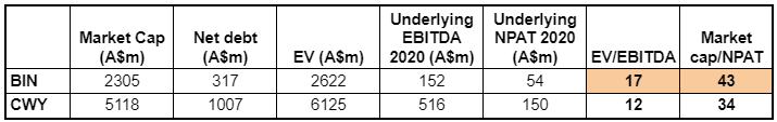 Overall, the current offer comes at a significant premium to CWY valuation as well as recent transactions (based on my superficial calculations). However, the comparison with CWY is somewhat skewed as Cleanaway has almost no exposure in the construction/demolition market and operates mostly in municipal, commercial and residential sectors. CWY also has substantially lower margins. BIN had 27% and 31% EBITDA margin in FY19 and FY20 vs CWY had around 22% in both years, moreover, BIN’s NPAT margin in FY20 was 10.5% vs 6.5% for CWY.