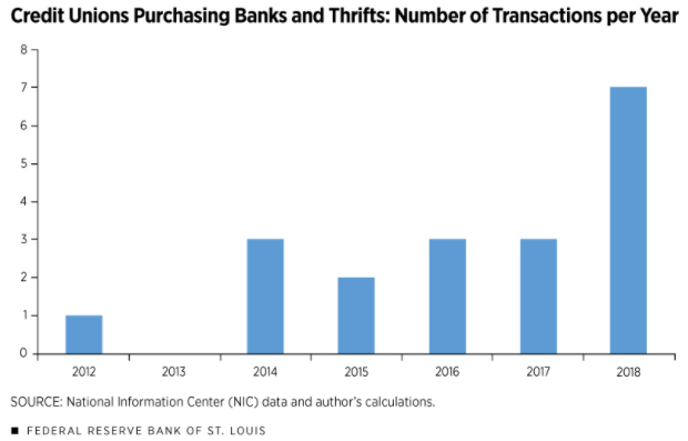This transaction type is completely standard among bank acquisitions by credit unions. Apparently, certain laws do not allow credit unions to merge with banks or even acquire bank stocks. Therefore, all such acquisitions happen in this form of purchasing assets and liabilities. In 2020 credit unions acquired 7 banks, 16 in 2019. Historical transactions: