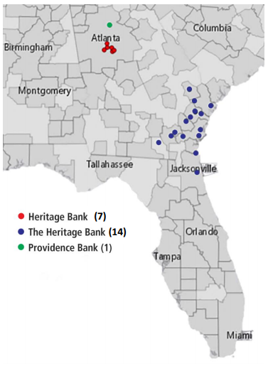 HSBI serves as a holding company for Heritage Southeast Bank, which operates under the names of Heritage Bank, Providence Bank, and The Heritage Bank in its various markets. HSBI has $1.5bn assets ($1.3bn deposits) and operates 22 branches in Georgia.