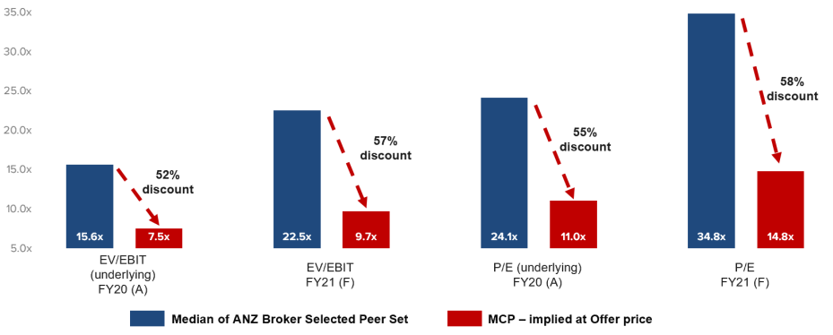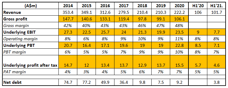 One of the Kin Group’s arguments for the low offer price is that MCP revenues have been declining for several years now. However, the performance wasn’t that dim as the decline in revenues was largely the result of the business transformation strategy – refocusing towards owned brand growth, closure of unprofitable operations, exit from multiple agency brands, and overall brand consolidation (fewer, larger brands). The company was able to materially increase its margins – despite 37% drop in revenues, earnings remained stable and even started increasing during 2020. MCP also cleaned its balance sheet with net debt reduced to A$3.8m (H1 FY21) from A$75m in 2014.