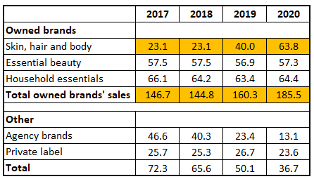 Owned brand sales growth was mostly driven by the success of Dr. Lewinn’s brand, especially in China. In 2019 the company signed a JV with ABM to sell Dr. LeWinn’s brand products through ABM distribution channels in China. The JV turned out highly successful growing Dr. Lewinn’s sales in China 5x during FY19 and further +130% during FY20. Dr. Lewinn’s is currently MCP’s Nr. 1 brand and has generated 26% of revenues in FY20 (ending June).