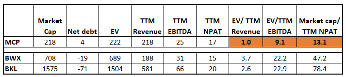 - The buyer has made a similarly opportunistic offer before for The Reject Shop (TRS.AX) in 2019 at A$2.70/share. Only 12% of TRS shareholders tendered their shares, however, the buyer didn’t raise the price and made no subsequent offers. Worth mentioning, that currently, TRS trades at A$6.68/share. So although I’ve marked this as a separate risk, the interest from Kin by itself might be a decent indication that MCP is cheap.