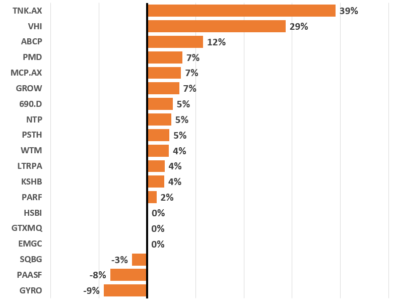 Tracking portfolio (+6% MoM) was most positively impacted by the performance of TNK.AX, VHI, and ABCP ideas.