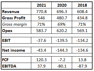 The company is struggling with the competition and over the years saw its revenue growth decline from 30%+ to 11%. One of the key criticisms the company receives is poor financial discipline and highly elevated opex, which keeps it from reaching breakeven and generating meaningful cash flows. High stock-based compensation (around $150m – 30% of gross profit) adds further negative sentiment.