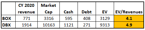 At the moment BOX trades at 4.1x EV/Revenues, marginally below its peer Dropbox (DBX) – the difference seems warranted given DBX larger size, higher revenue growth (15%-19%), higher gross margins (78%), slightly better profitability, and FCF.