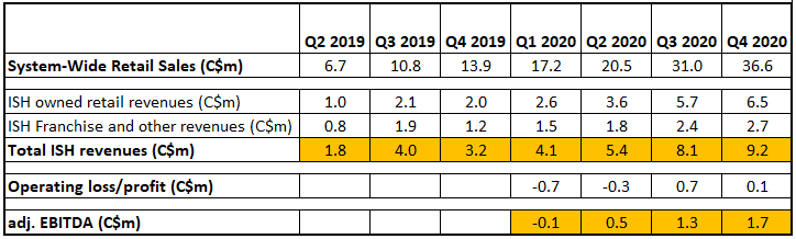 – System-Wide sales of C$35.9m and total revenues of the company of C$8.8m – slightly below the figures reported during Q4’20.