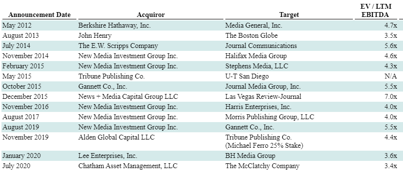 - December 2020 – Alden made a bid for Tribune Publishing at $14.25/share.