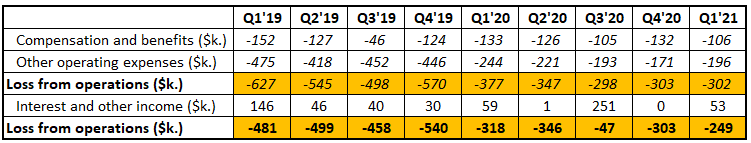 In 2020 the company received a $53k PPP loan, which has been forgiven and accounted as income in Q1’21. Elevated interest and other income in Q3’20 is mostly from the sale of the previous company’s ticker (WISH) for $250k.