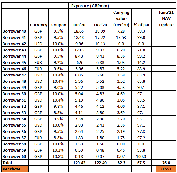 - Borrower 43 – A highly structured transaction that is ultimately backed by a portfolio of leases made by a specialist finance company in Mexico. LTV (per the borrower) has gone from 93% in June 2020 to over 100% in 2021. As of June 2020 the loan was still current, but given the high LTV, the jurisdiction and some indications of bad faith on the part of the borrower the manager has written this down to 72c.