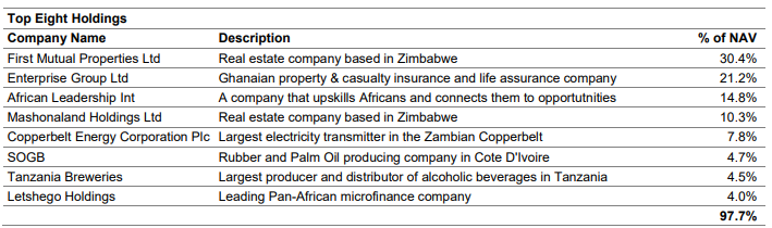 - Another potential bottleneck of the liquidation strategy could be the two holdings in Zimbabwe (First Mutual Properties and Mashonaland, see table below). It’s currently nearly impossible to transfer funds out of Zimbabwe and it might take a while to make this possible without doing it at a vast discount at NAV. Zimbabwean assets make up around 41% of NAV.