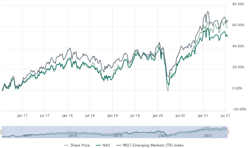 The tender offer will be launched in fulfillment of GSS obligation to buy back shares if the fund did not outperform the benchmark (MSCI Emerging Markets index) over 5 years ending on the 30th of June’21. The benchmark was missed by only 1%. At the moment, the company intends to change its investment manager to Fidelity (shareholders will also vote on this in August). The management fee is expected to decrease from 0.9% to 0.6%. Additionally, Fidelity agreed to a 9-month fee waiver. The upcomig transition to a much bigger name investment manager with lower fees might incentivize shareholders not to tender their shares.
