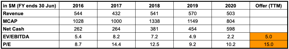 A consortium led by ex-CEO (claims to own 6.8% shares) is trying to acquire US-listed Chinese company Hollysys at a $17.10/share, a spread of 9% to current prices. Both the initial $15.47/share and $17.10/share (raised in Dec’20) offers were thrown out by Hollysys’ management as the proposals allegedly undervalued the company. After Mr. Shao (Ex-CEO) was removed, a poison pill was placed to prohibit any holdings in Hollysys above 15% without management’s approval. Currently, the buyer hopes to bypass the poison pill by commencing a solicitation of consents from Hollysys’ shareholders with the deadline set for the 20th Aug’21 (subject to extensions if no court ruling is present at that time). The current offer comes at 5x TTM EV/EBITDA and 15x TTM P/E – Hollysys has two-thirds of its market cap in net cash and looks both historically and nominally cheap from both an EV/EBITDA and a P/E perspectives. If the buyer is successful with shareholder consent solicitation, investors stand to earn 9% spread. There is also plenty for further bid improvement if the board engages in discussions with the buyer group. The downside looks well-protected by cash on the balance sheet and cheap valuation.