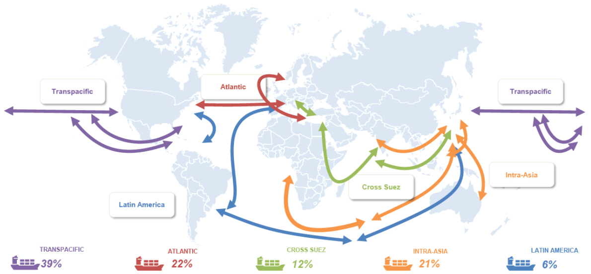 ZIM is an asset-light container liner shipping company based in Israeli. It doesn’t own any ships and only operates the chartered-in liners. The fleet consists of around 98 vessels with a total capacity of around 3m TEU (unit equivalent to 20ft. container size). ZIM transports mostly dry van containers (general cargo, commodities in bundles, cartons, boxes, loose cargo, furniture, etc.). Additionally, in Feb’21 the company has also chartered 10 15k TEU capacity LNG (liquified natural gas) vessels. The company operates across these routes: