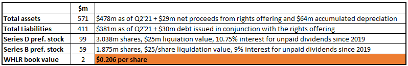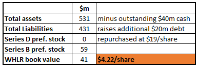 At the moment, Series D share overhang nearly pushes common shares under the water. The table below shows current WHLR book value calculations: