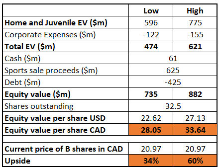The simplest and likely the most conservative way to value the company pro-forma for the sale of the sports division would be to take the Juvenile and Home segment’s valuation provided above in the Dec’20 circular and add the current sale proceeds of the Sports business on top of that. Net pre-tax proceeds are US$735m. Assuming 15% tax on the whole amount (likely to be much lower), we get $625m in after-tax proceeds. The model below also deducts capitalized overheads (figures also from circular) – these are expected to be lower going forward as the business is now smaller.