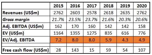Dorel’s financial performance was negatively impacted by an accelerated international M&A spree and new debt issues in 2012-2014. Nevertheless, till 2018 the stock traded at much more reasonable adj. EBITDA multiples in the range of 7x-8x. The share price decline in 2018 coincided with the U.S. – China trade war fears and tariffs impacting Dorel’s operations – the company has a factory with two manufacturing facilities in China and is also sourcing some of its products from Asia. On top of that, Dorel made a strange move to record massive impairments to the Juvenile and Sports divisions on the grounds of declining Dorel share price. These resulted in paper operating losses of nearly $0.5bn in 2018 (vs $53m profit in 2017). After further tariffs were announced in 2019, the stock just kept rolling down, finishing 2019 in the range of C$6/share price vs C$31+ in 2017. Looking back, the market’s reaction seems significantly overblown – the company managed to offset the negative tariff impact by raising prices, sales / gross margins remained stable and the impact on profitability was limited.