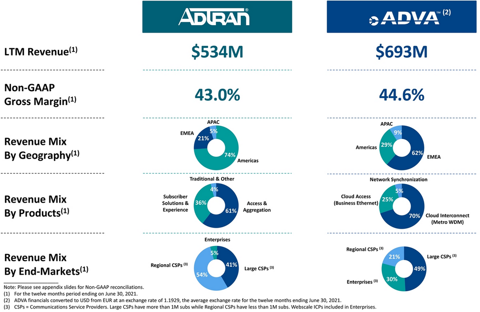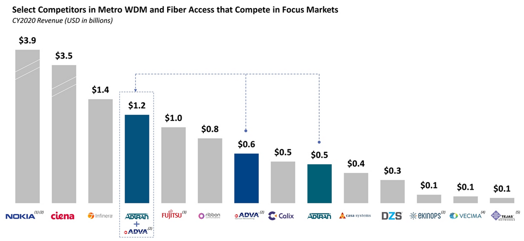 The merger will combine ADTN’s fiber access and aggregation, residential enterprise connectivity and cloud-based network optimization solutions with ADVA’s fiber backhaul and data center interconnect, enterprise fiber access and connectivity, and network synchronization solutions. Due to low product/services overlap management presents merger as highly synergistic and expects to create vertically integrated fiber networking solutions provider. Both firms have complementary geographies and expect significant cross-selling opportunities – US$60-$120m revenue synergies (10% of combined revenues on a higher-end). Cost synergies are estimated at $52m from supply chain efficiencies and operating model optimization.