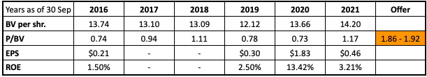 On the 30th of September, a 2-branch Home Savings Bank entered into a definitive agreement to be acquired by Dupaco, a private credit union with 18 locations. Following the transfer of assets/liabilities in exchange for cash, Home Savings Bank and Home Bancorp will settle their remaining obligations and distribute the left-over cash to shareholders. Distributions are expected at $26.47-$27.32/share. The distributions should come within 180 days after the suggested merger completion in Q2 2022 but may take longer. The deal is subject to regulatory and shareholder approvals, both of which are likely to pass as this is a small Bancorp transaction (unlikely to receive regulatory setbacks) and comes at a considerable premium to historical valuations at 1.86-1.92xBV. Management holds ~8% of shares and supports the merger. Both of HWIS’ branches are located in Wisconsin, where Dupaco also has two operating locations. HWIS trading volume is limited, but has somewhat increased after the merger announcement. Downside to the pre-announcement price stands at just over 30%.