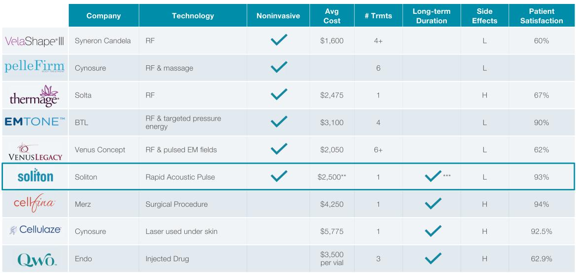 - SOLY’s technology and device target tattoo removal and cellulite treatment markets. ABBV is strong in the aesthetics market due to the Allergan acquisition last year ($63bn market cap), however, operates in different segments. Abbvie’s closest asset to SOLI’s technologies is the body contouring business Coolsculpture, however, this business focuses on targeted fat removal and is not even effective for cellulite treatment.