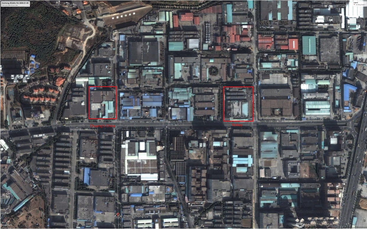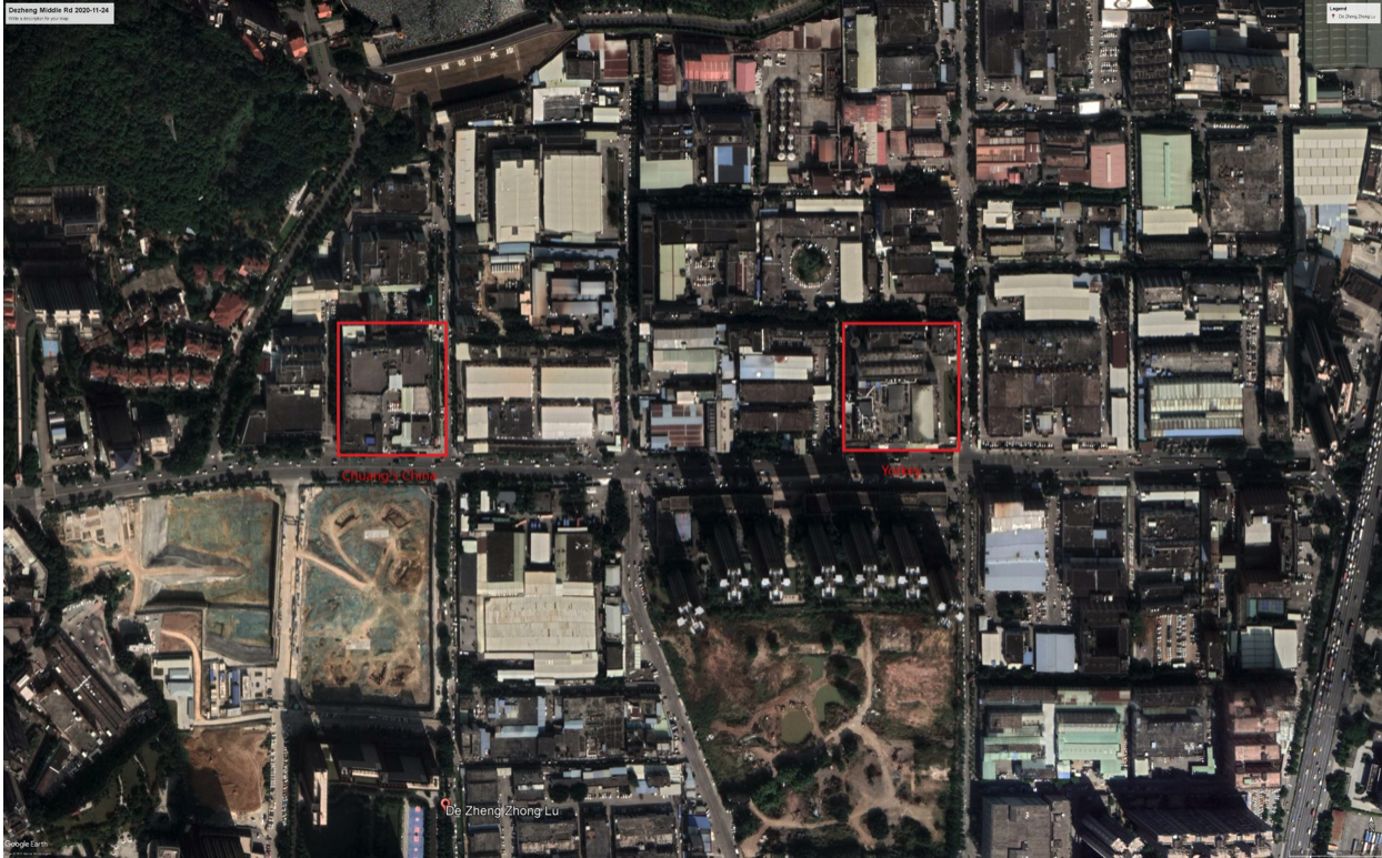- The main factory is located on the North side of Dezheng Middle Road, Changan, Dongguan, PRC. Overall, the surrounding district is in the redevelopment process with many of the factories now gone and replaced with residential construction. Two screenshots are provided below, one from 2009 and another from 2020 clearly mark this transition. There are also two red boxes: the right box marks the approx. outline of Yorkey’s site (the 2006 property valuation document states 16,647 sq.m. and a building area of 40,138 sq.m.) and the left box marks a very similar property to Yorkey’s (land area of 18,990 sq.m. and a building area of 39,081 sq.m.) The left property is now owned by Chuang’s China Investments (CCI) and has a closed printing factory, which is now leased while CCI waits for the right opportunity to convert the property to residential use. CCI’s annual report (ends 31 Mar’21) discloses a market value of 223m CNY. Assuming the same value per square meter of land for Yorkey, its property would be worth around CNY196m or US$31m.