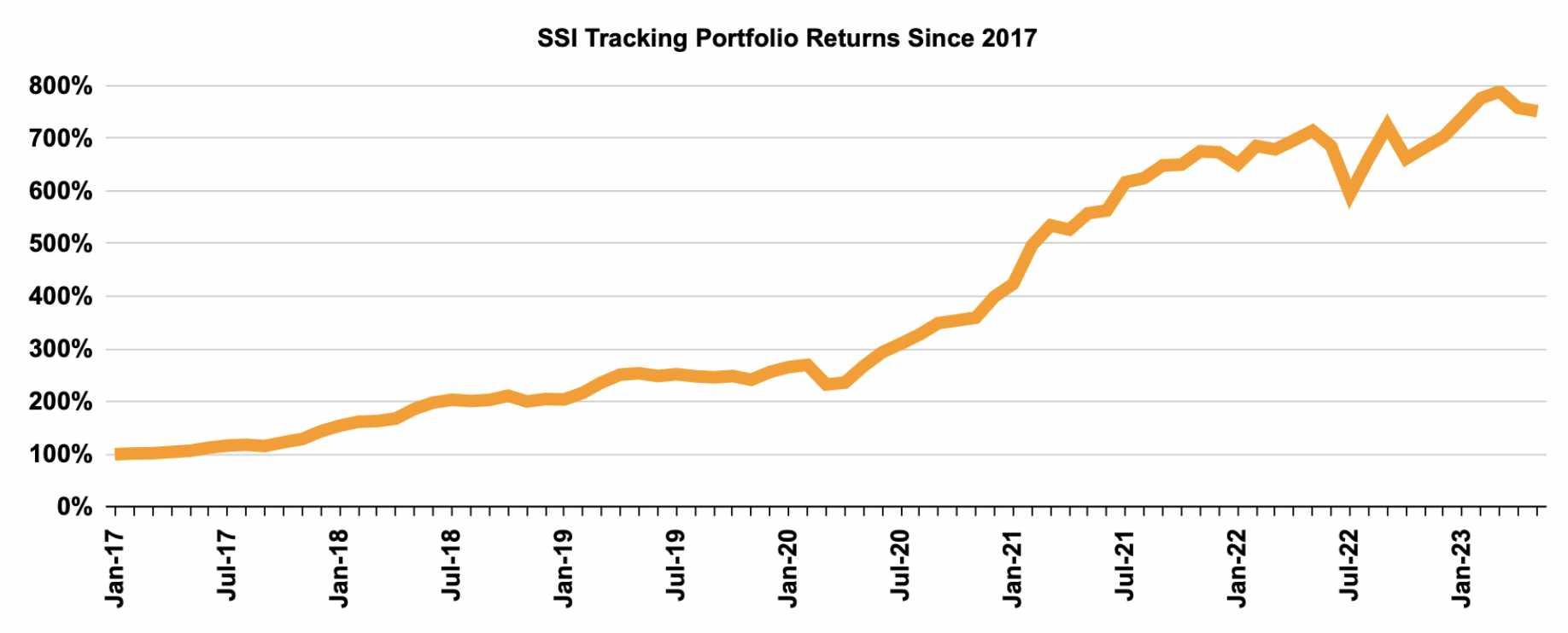 SSI tracking portfolio is down -0.8% in April 2023. A detailed performance breakdown is provided below.