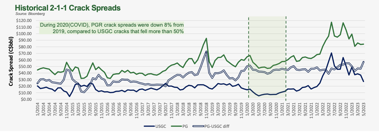 PGR was acquired in Oct’19 for C$215m or 2.9x EBITDA. The crack spreads were materially lower back in 2019 (around C$50-C$60/bbl vs C$85/bbl in Q2’23. At the time, management was boasting how opportunistic and cheap the acquisition was – the purchase was made at a few turns lower EBITDA multiple than peer valuations.